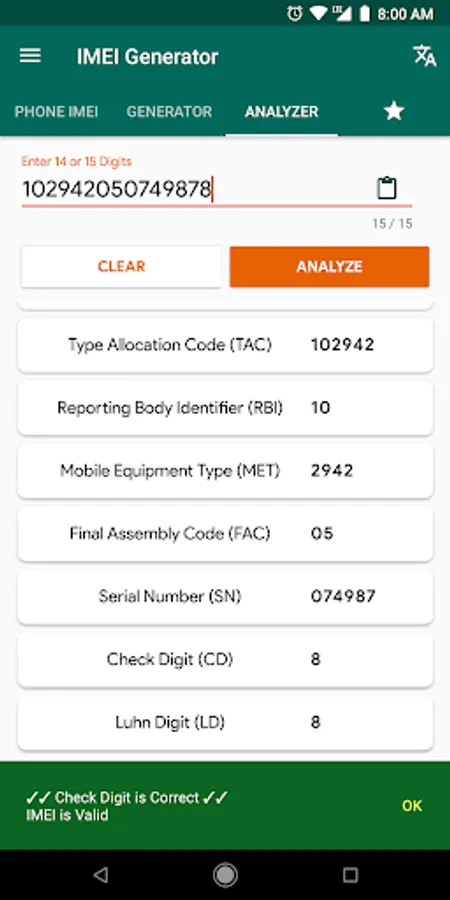 ✔ The ‘ANALYZER’ tab can be used to analyse IMEI piece by piece & check if an IMEI is valid or Not.