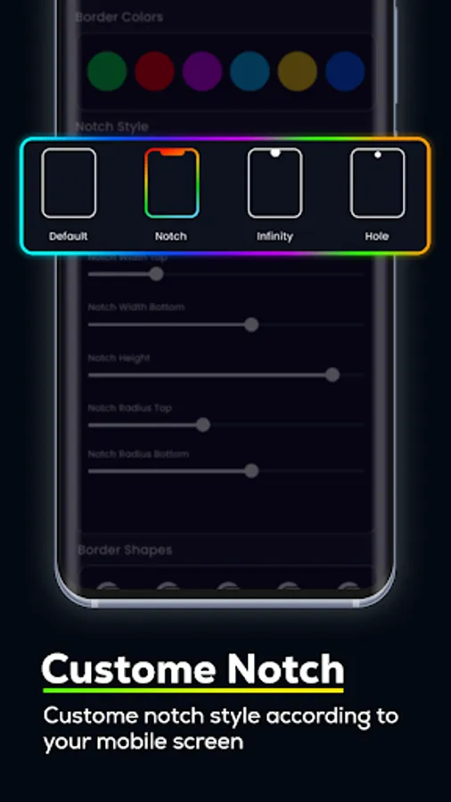 Modify Notch width, peak, high and backside notch radius, No matter your device's notch type – whether it's Infinity U, Infinity V, or any other design – The app's notch-adaptive lighting and animated borderlight themes automatically adopt your device’s Notch style,