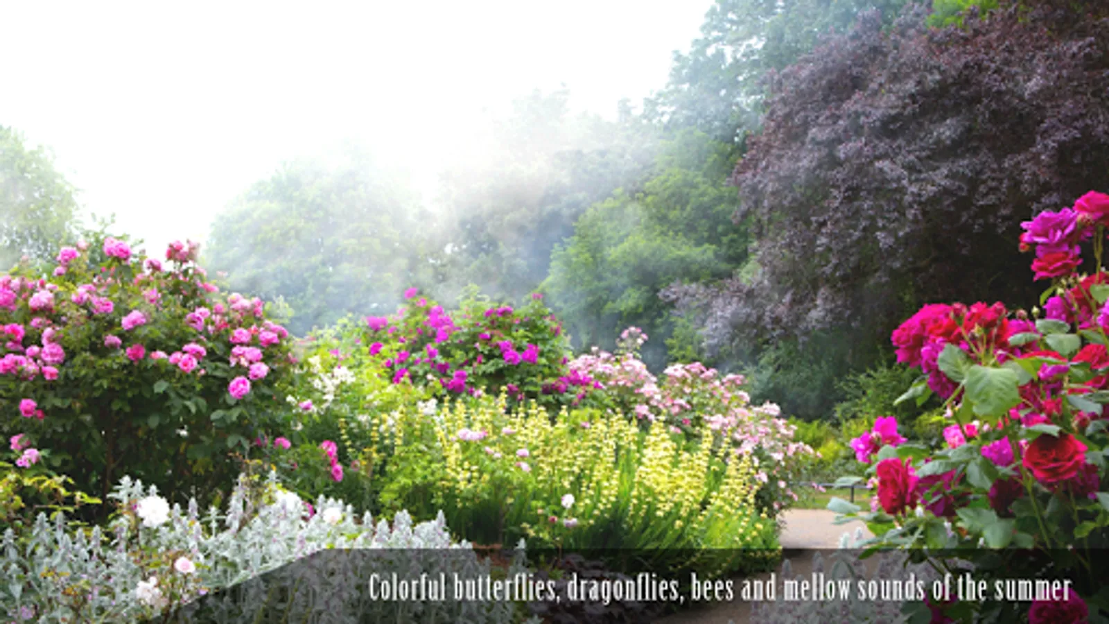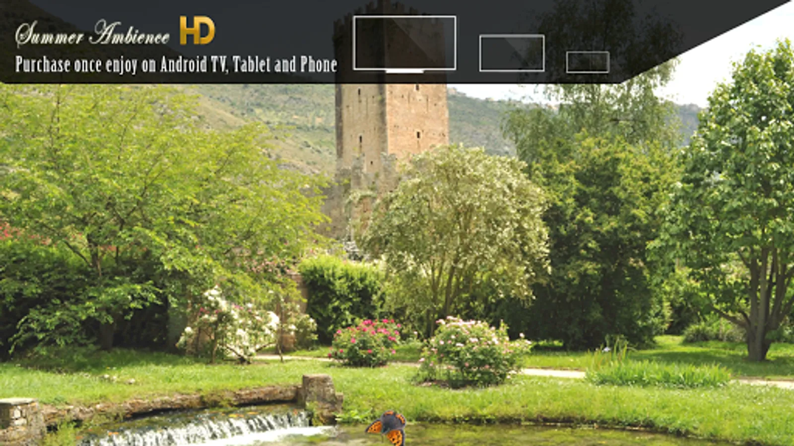 Bring the ambience of picturesque summer scenes right onto your Android TV, Tablet / Phone, complete with animated colorful butterflies, dragon flies and bumble bees and soothing relaxing summer ambient sound.