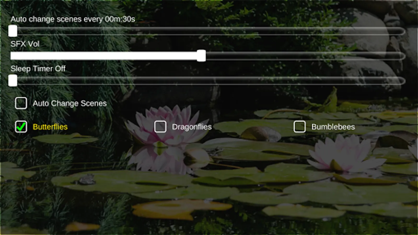 Settings allow you to toggle butterflies,dragon flies and bees, you can also set a sleep timer.