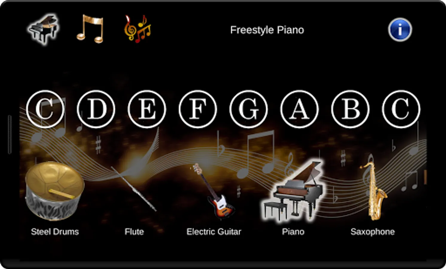 Play freestyle, learn a tune from a variety of songs, have the computer play randomly and spot a melody.