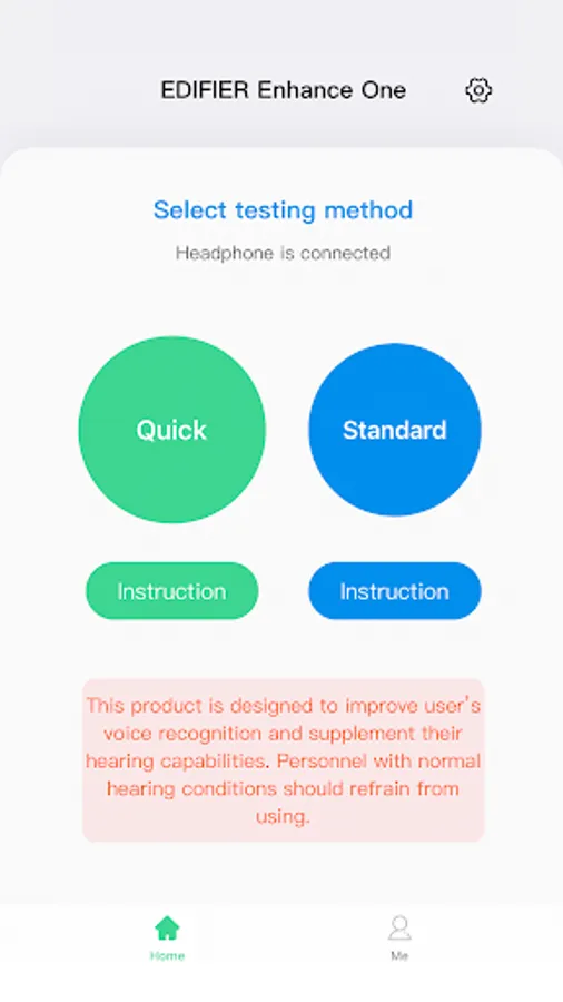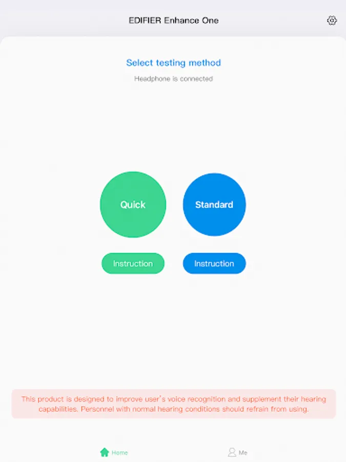 Edifier Enhance App provides hearing test services. An Edifier hearing supplement headphone is required. Connect the headphone and perform the hearing test in the APP; export the results to customize your headphones tailored to your needs.