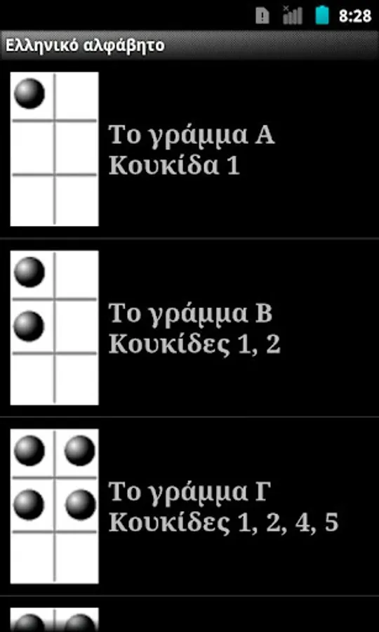 This app is a presentation of Greek Braille writing system. Aim of this app is to become a handy tool for learning and a quick guide for later. It contains 3 groups from basic symbols of everyday use, the multitone system, mathematical operations by Meneidi and also by Nemeth, various other symbols, as well as the English alphabet.