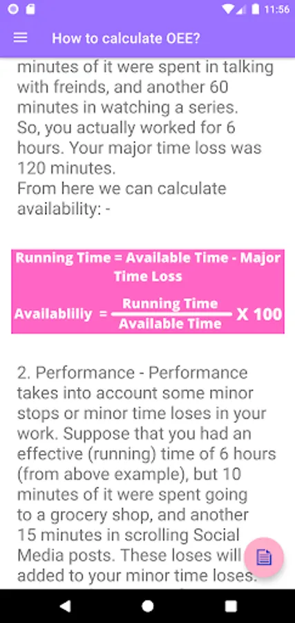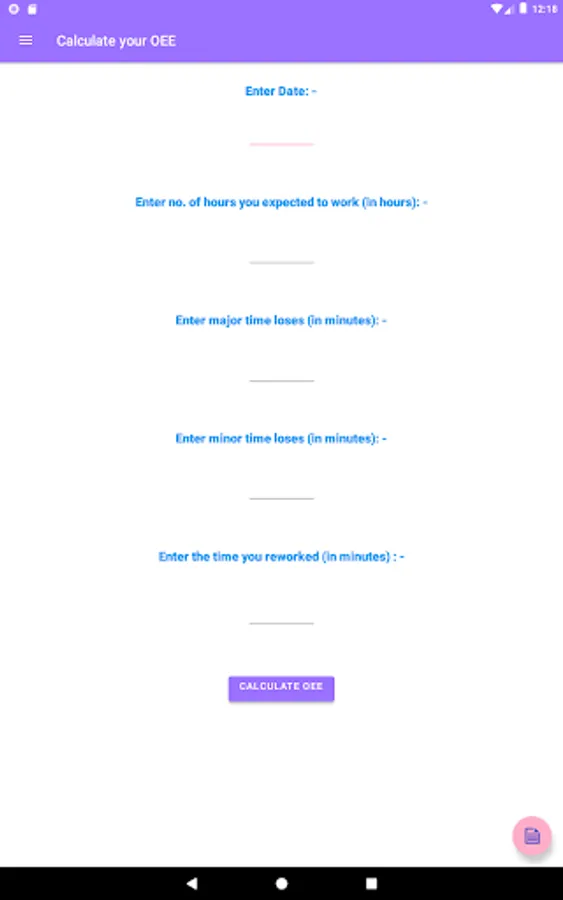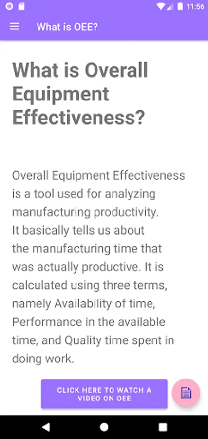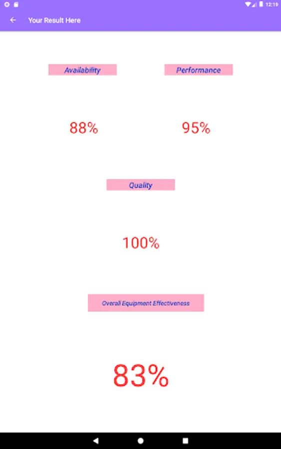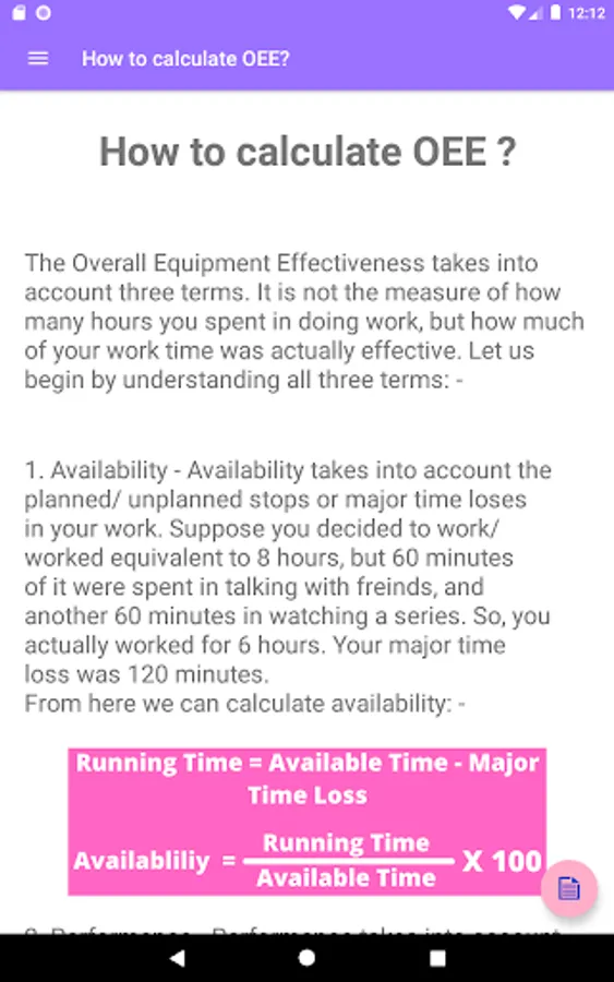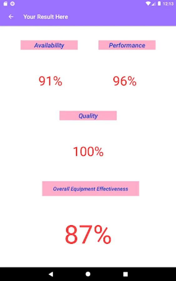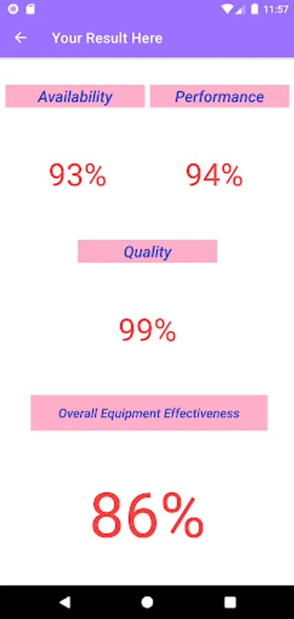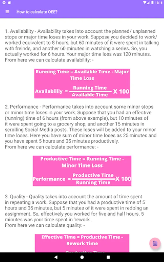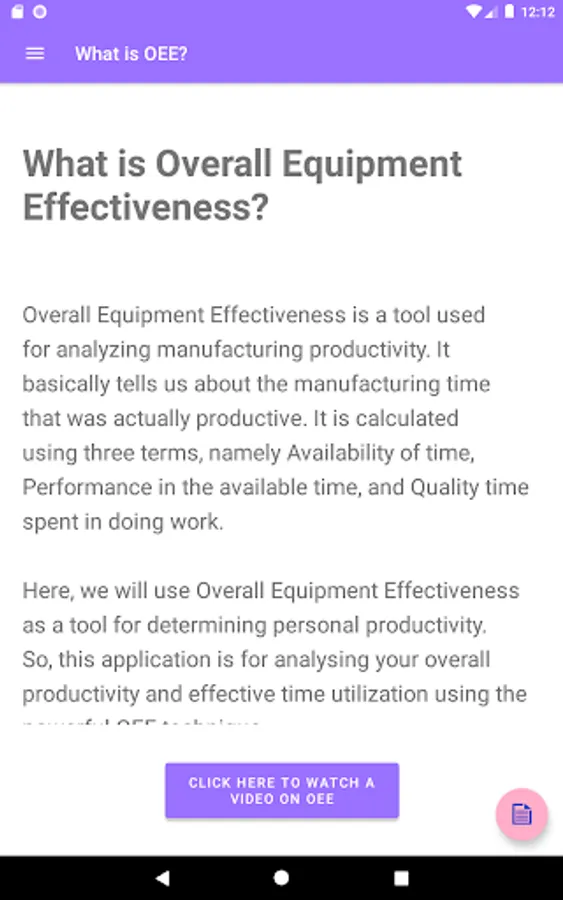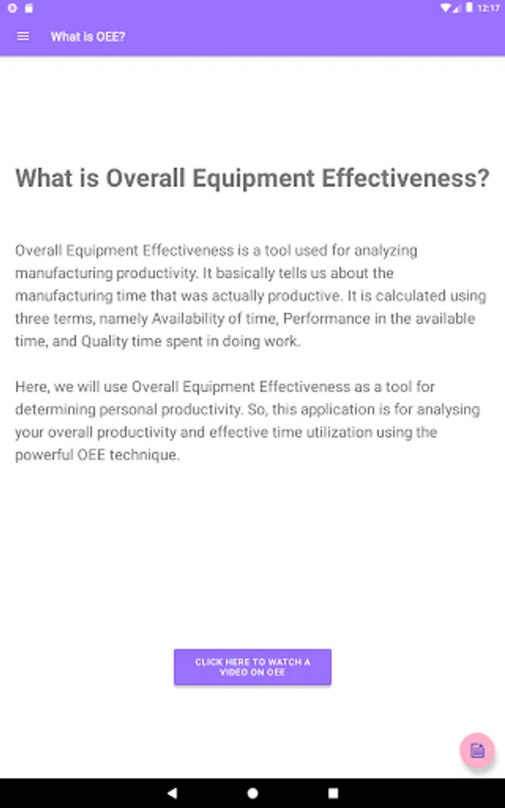 Overall Equipment Effectiveness is a Japanese technique for productivity analysis. Here, in this application we try to analyze our personal productivity using the same technique. The app contains details about this technique, OEE Calculator, and a table that stores your daily progress.