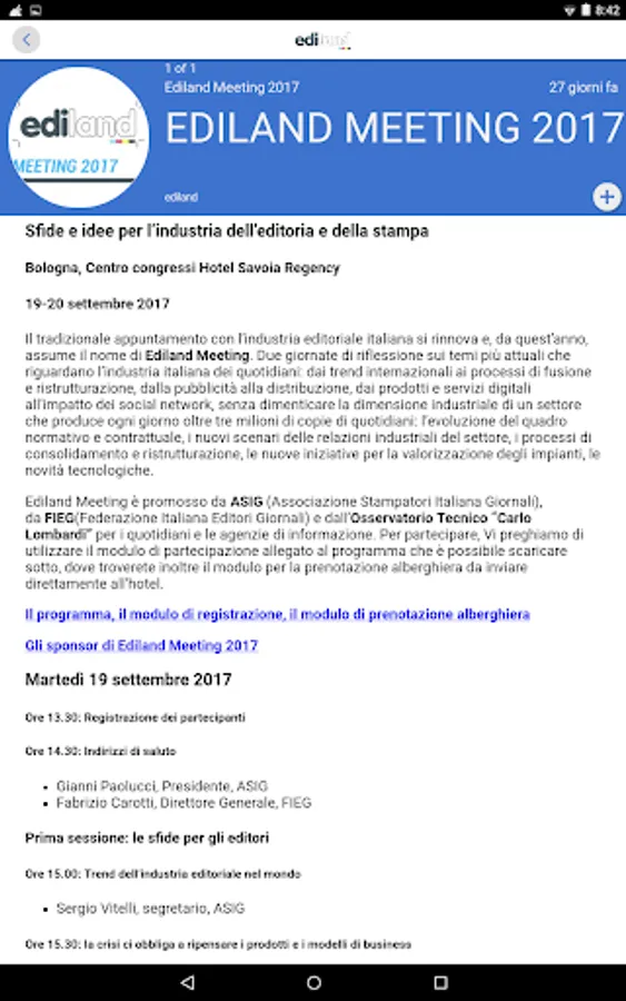 On Ediland find the program and the information to participate in Ediland Meeting, the conference which annually compares the protagonists Italian newspaper industry, and you can subscribe to Ediland Newsletter, the information service delivered right to your mailbox.