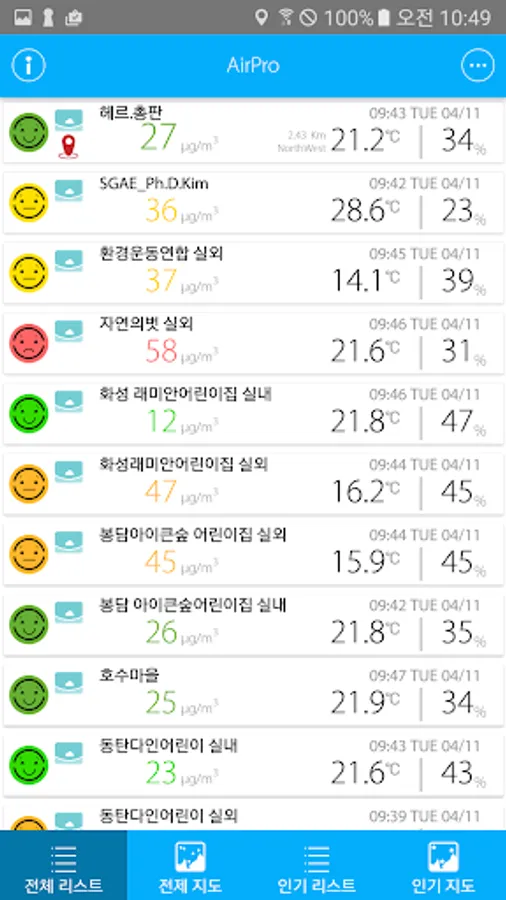 한국의 공기 질 180개국 중에서 173위!. OECD 국가 중 최하위의 공기를 가진 한국. 이런 환경에 우리의 가족과 아이들이 노출되어 있어요. 더 심각한 것은 현재 운영 중인 측정소가 절대적으로 부족하다는 현실. 이제 AirPro을 통해 실내, 실외 등 실생활에서 언제든지 실시간으로 공기 질을 확인하세요.