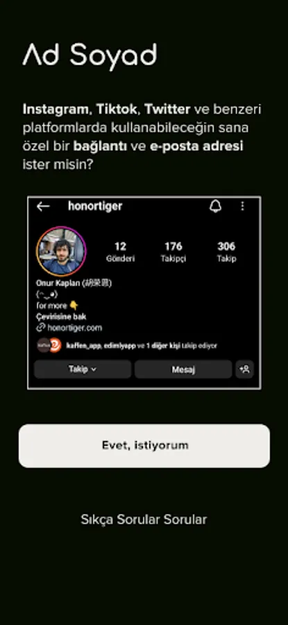 "Name Surname" application helps you easily create your web presence and provides a more professional look on your social media profiles. With this app, anyone can create their own brand with a customized domain name and gain more followers.