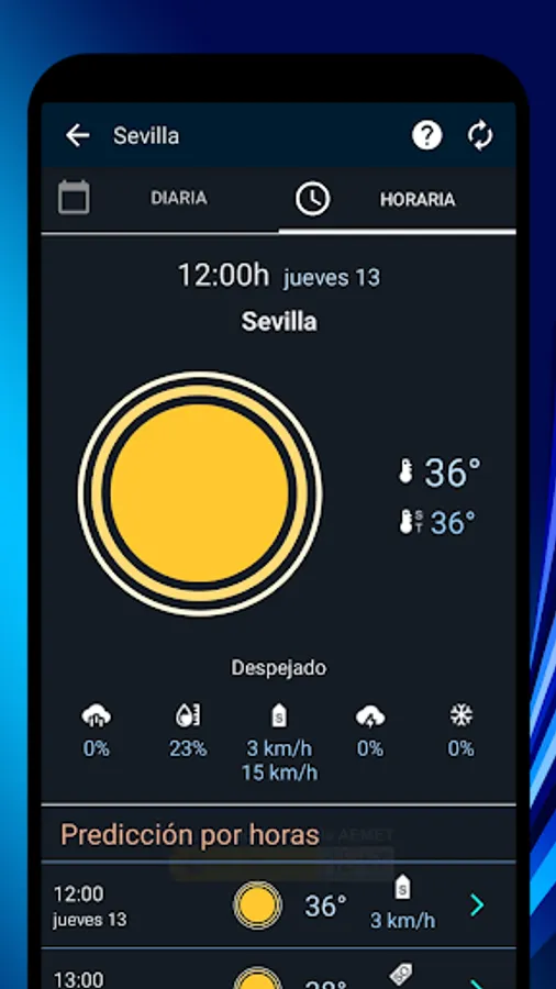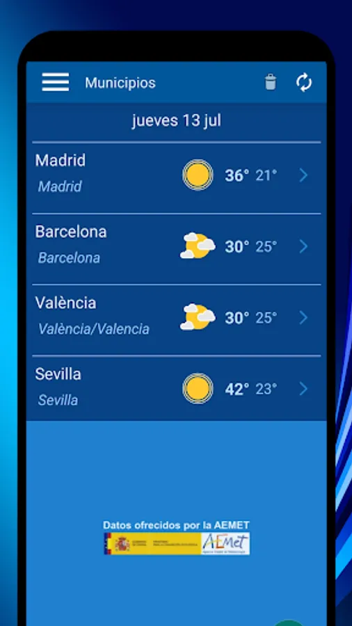 Welcome to 'The Weather in Spain'! Stay informed about the weather throughout Spain with our reliable and accurate application with data from the AEMET. We offer detailed 7-day and hourly forecasts in all cities and municipalities across the country.