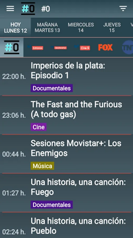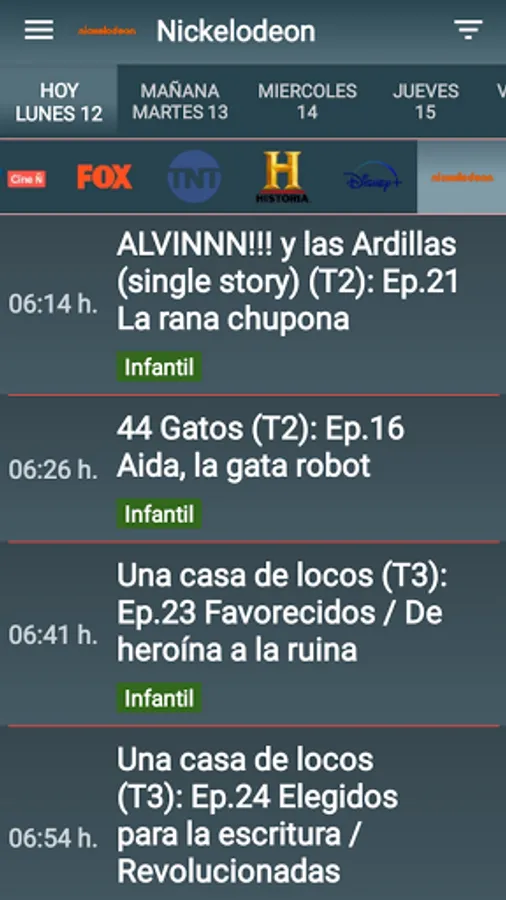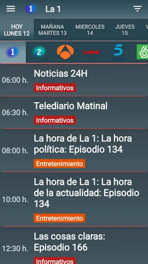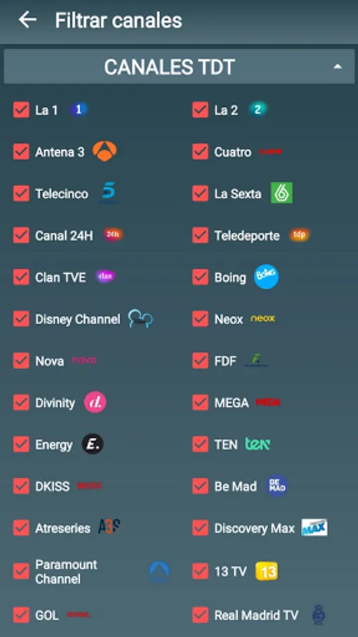 The application contains the daily television programming grid for the next week. It also contains a filter for favorite channels and labels by themes such as (sports, children's, news, documentaries, movies, series, entertainment) to detect the content you are looking for more easily.