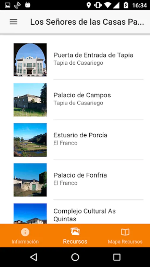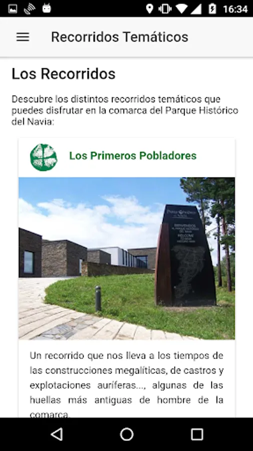 The application will allow you to know the region of the Navia Historical Park and its resources from your mobile device accessing the information of each resource and its location, being able to create the routes to facilitate access, without the need of having an internet connection.