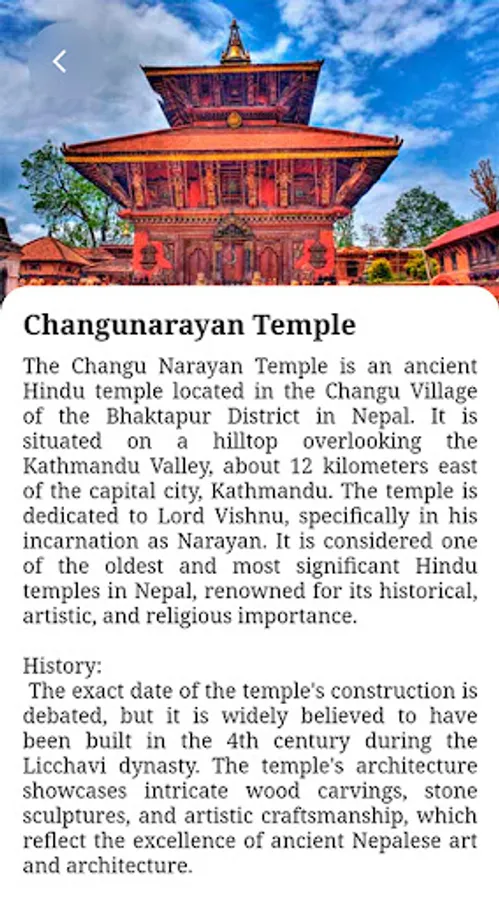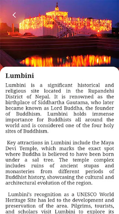 Nepal is renowned for its unparalleled natural beauty. The app allows you to discover Nepal's diverse landscapes, from the towering peaks of the Himalayas to lush jungles teeming with wildlife. You can explore details about national parks, trekking routes, and pristine lakes, all within a few taps.