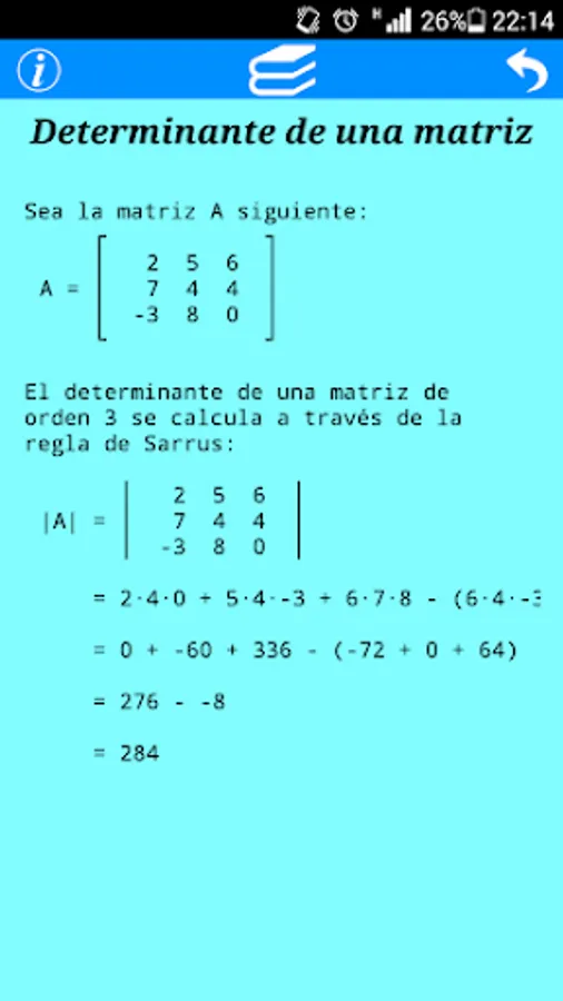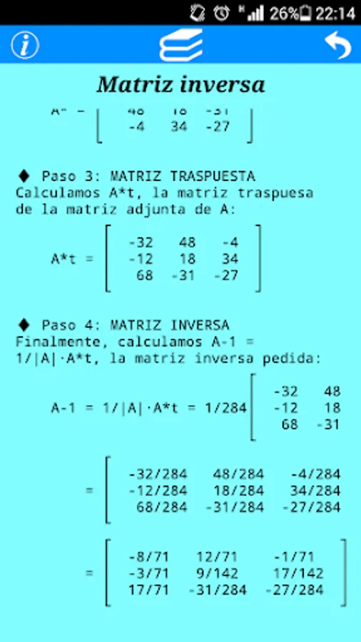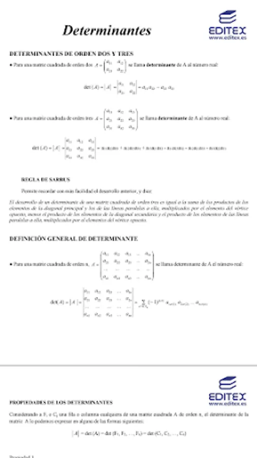 This application of Editorial Editex S.A. calculates determinants and inverses of matrices. It includes the following sections: