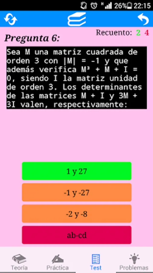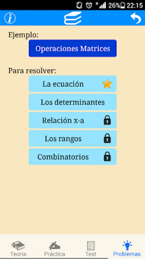 - Test: allows you to perform a self-assessment with 10 test-type exercises collected randomly