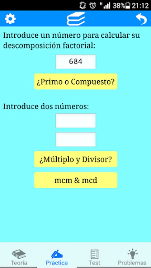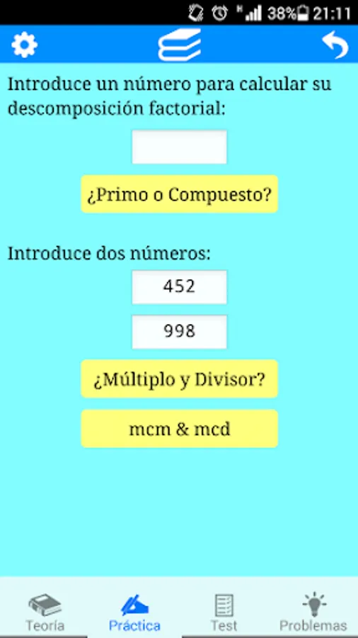 - Practice: it allows to calculate the lcm and the gcf between two numbers, in addition to showing their factorial decomposition and classifying them into prime or compound numbers.
