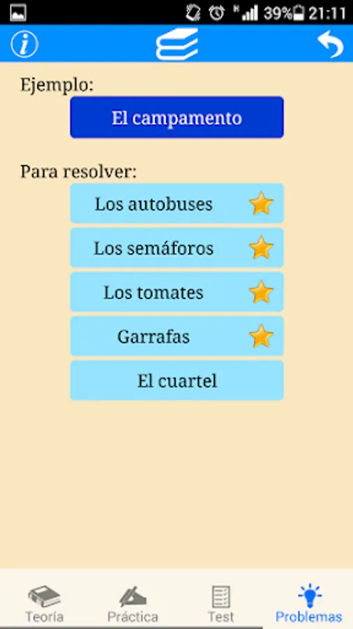 - Problems: this section is intended to solve problems, one solved as an example and another 5 proposed to the user.