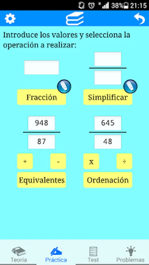 This application of Editorial Editex S.A. Performs basic operations with fractions. It includes the following sections: - Theory: contains a document in PDF format with a summary of contents.