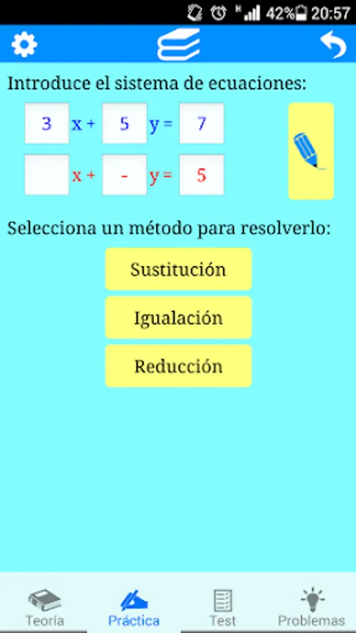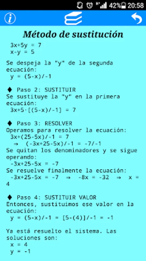 This application of Editorial Editex S.A. solve systems of linear equations of 2 unknowns by substitution, equalization and reduction methods. It includes the following sections: