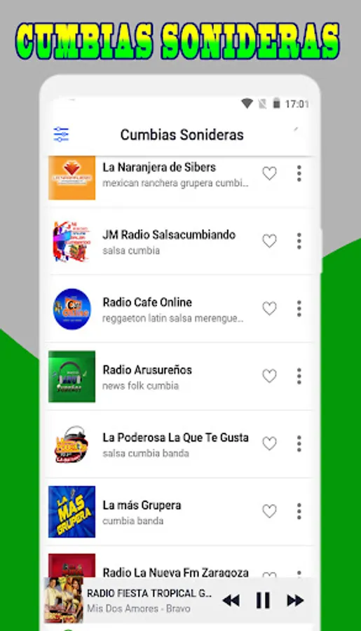 Con una interfaz amigable muy facil de usar y escuchar tu cumbias sonideras, para tener acceso solo necesitas estar conectado al internet o Wifi.