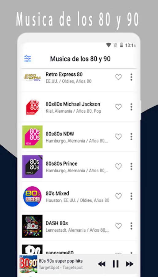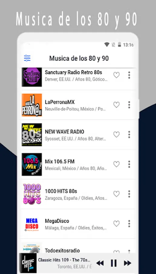 With a friendly interface very easy to use and listen to your music from the 80s in Spanish, to have access you only need to be connected to the internet or Wifi.