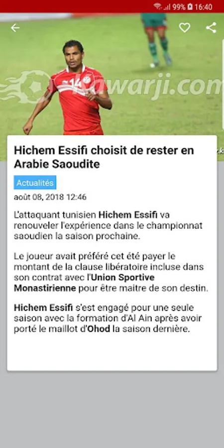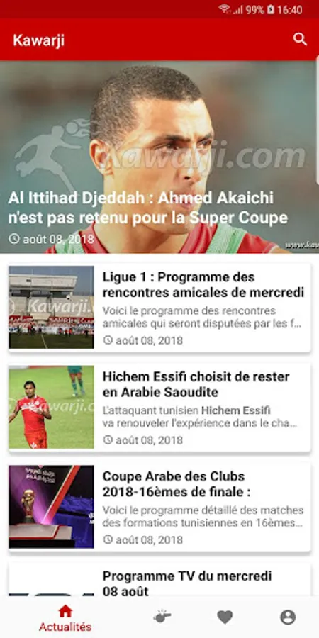 The Kawarji app allows you to follow Tunisian football competitions; Ligue 1, Ligue 2, Tunisia Cup, national teams, African competitions of CAF; Champions League, CAF Cup, African Super Cup, African Cup of Nations (CAN) and African Nations Championship (CHAN) but also the Top5 European Football Championships (La Liga, Serie A, Premier league, Ligue 1 and Bundesliga) as well as the best of the world competitions.