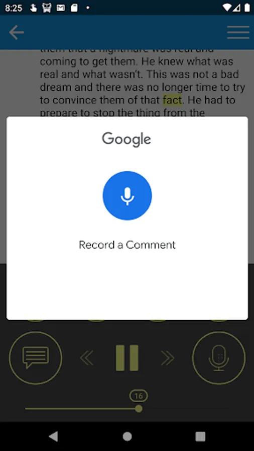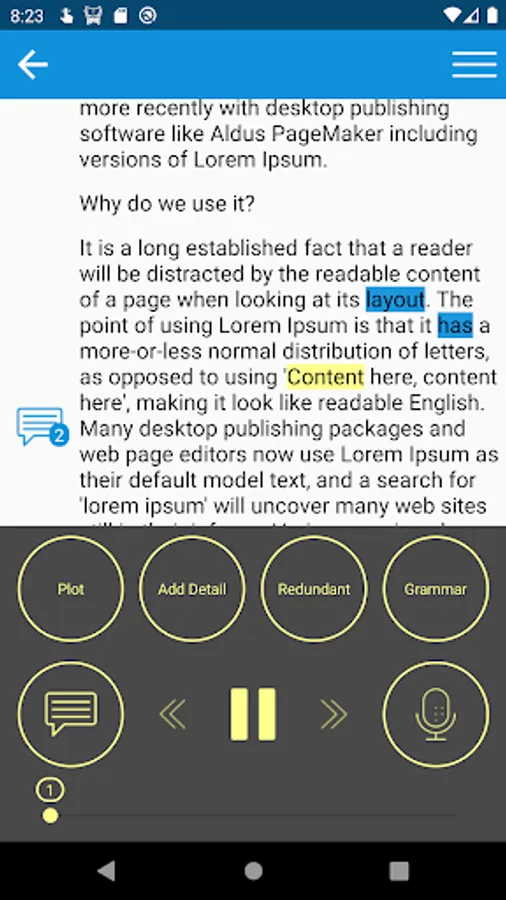 Simply tap, record, or type in a comment if you hear a grammar error, plot hole, or a boring section of your novel. Comments you add while listening in the app will appear in your source doc—Word, Google Docs, or Scrivener—so you can fix them later.
