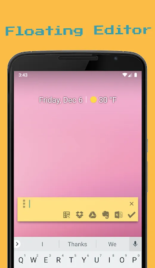 • Touch the floating window again to enter edit mode. The edit window is growing naturally as you note is getting longer. In the edit window, swipe left or right to navigate between notes. Swipe right to create a new note.