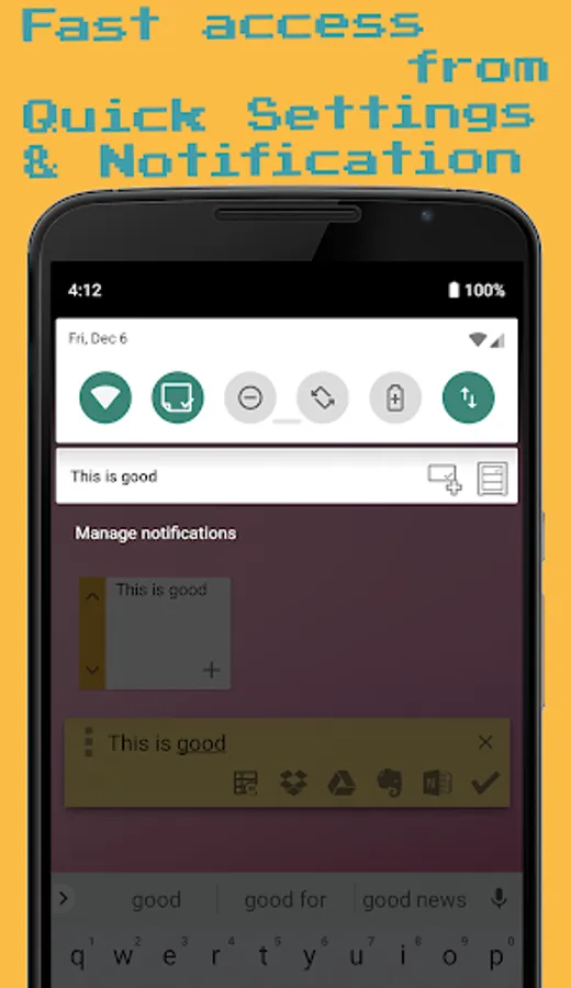• Quickly access notes from the Quick Settings tile and the top notification bar.