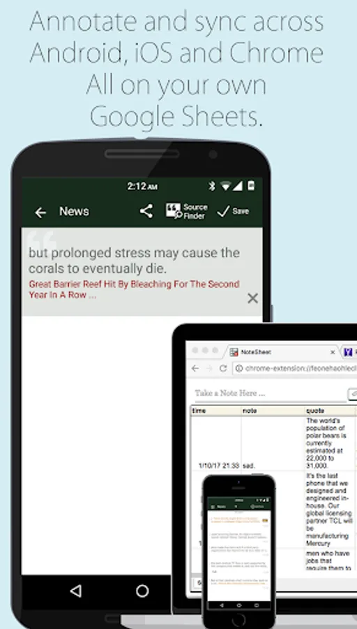 - Annotate and sync across Android, iOS and Chrome NoteSheet. Your Google spreadsheets become the curation cloud.