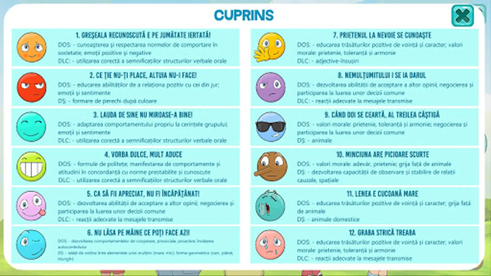 The application contains 12 edu-entertaining games and 24 animations, all elaborated in a modern and appealing manner. It addresses children in small and medium groups (3-5 years) and includes integrated learning activities on socio-emotional education for preschoolers.