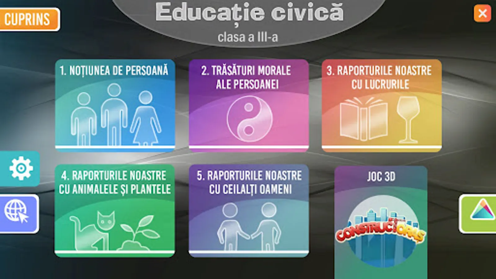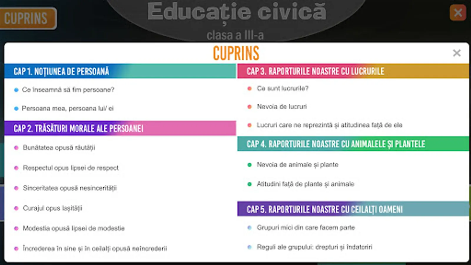 The application has 15 animated documentaries from the main themes of civic education: the notion of the person, moral traits of the person, our relationships with things, our relationships with animals and plants, our relationships with other people. It is addressed to children aged 9-11 years