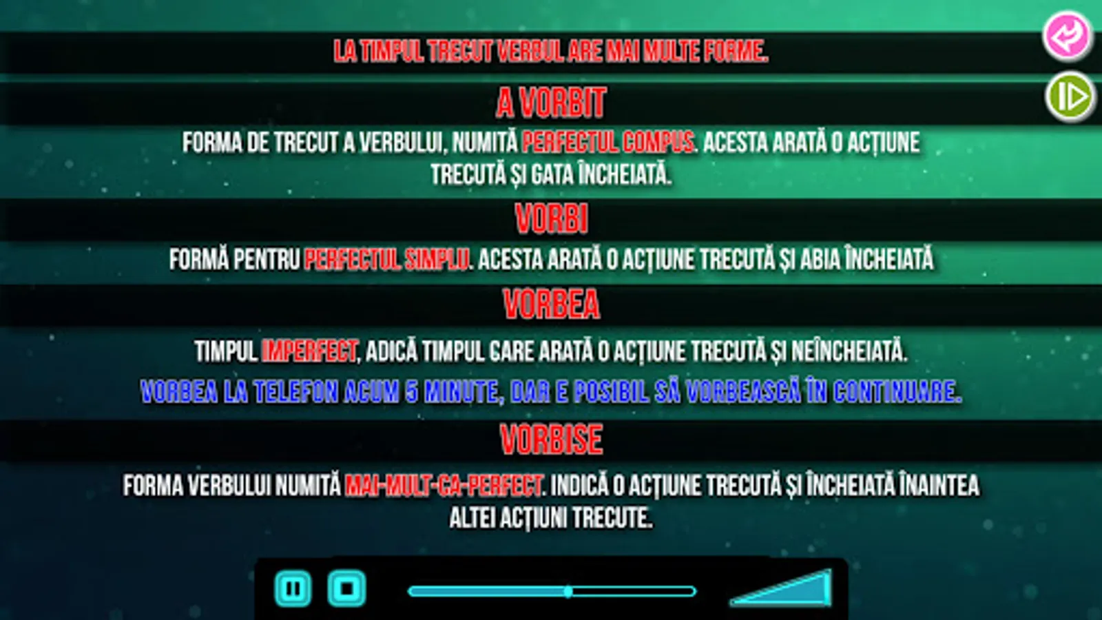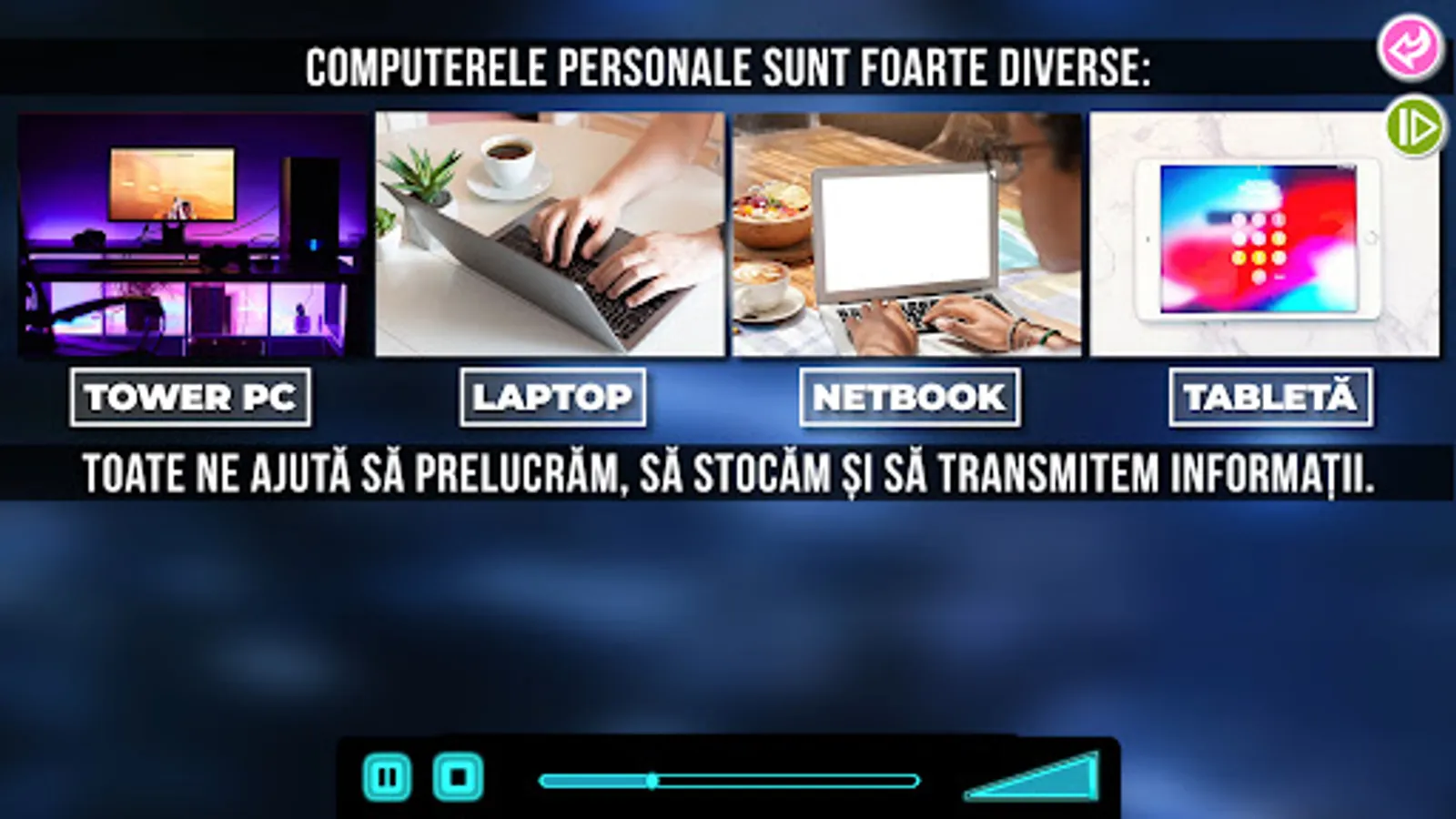 The application includes 30 animated documentaries from the main subjects to be studied in secondary school: mathematics, Romanian language and literature, history, geography, biology, technological education and practical applications, computer science and ICT, counseling and personal development and social education. The documentaries contain interesting information, spectacular images, curiosities, applications and a lot of useful tips in preparing for the 5th grade. It is aimed at children between the ages of 10 and 12.