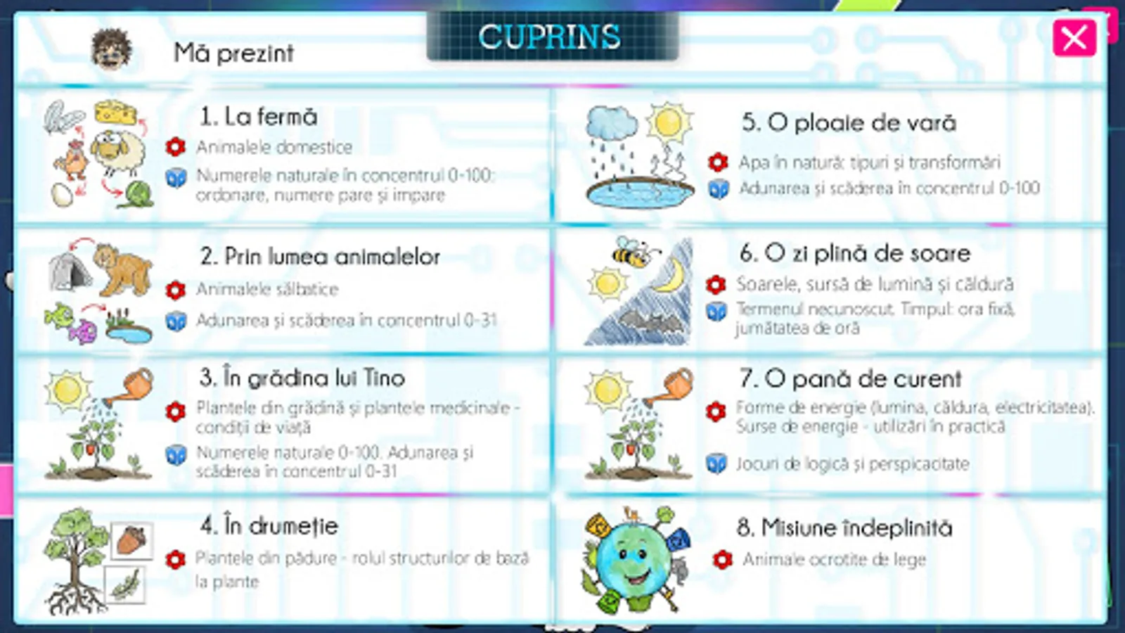 The two friends, Tino and Flory, explores the whole environment, seeking solutions to protect our planet. Accompanying them in the 32 educational animation and edu-fun 23 games, kid practicing his acquired knowledge of mathematics and exploring the environment.