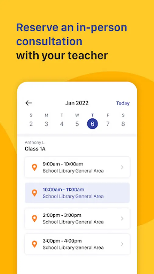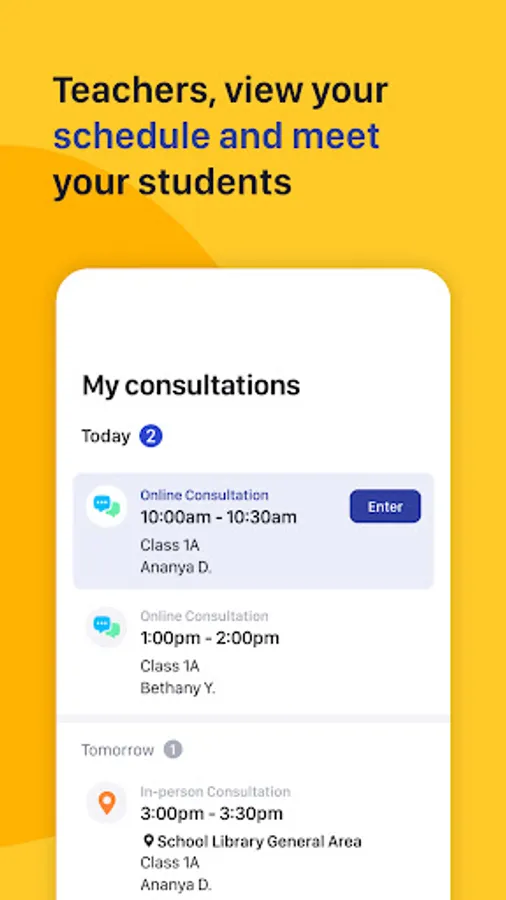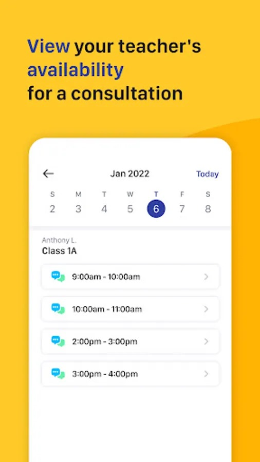 Teachers: You can view your upcoming consultations, participate in one-to-one online meetings and join the Class Chat conversation from the app. To list your availability to students, please login to the web-based service through your browser.