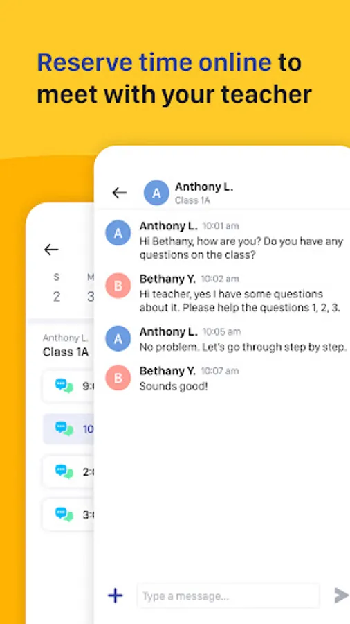 Easily reserve time with your teacher for in depth one-to-one help on specific class topics. See your teachers’ available time and schedule a meeting either at school or online through ClassMo’s chat service.