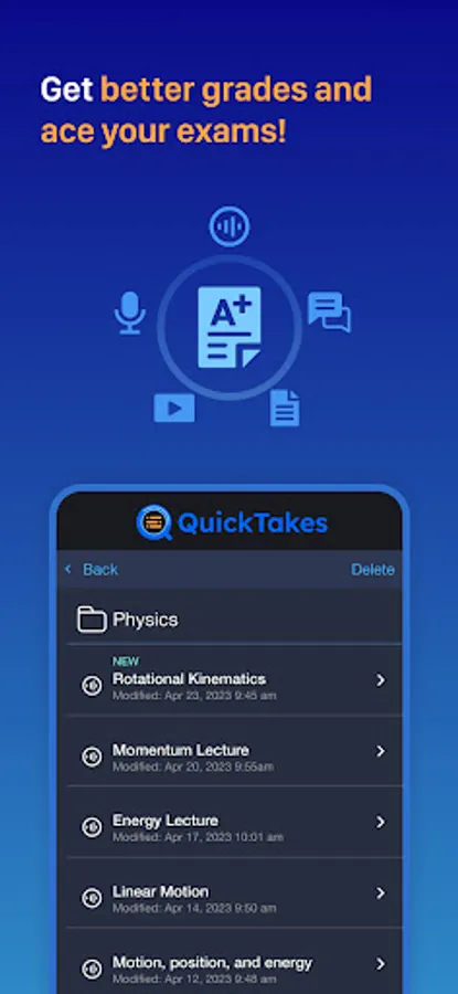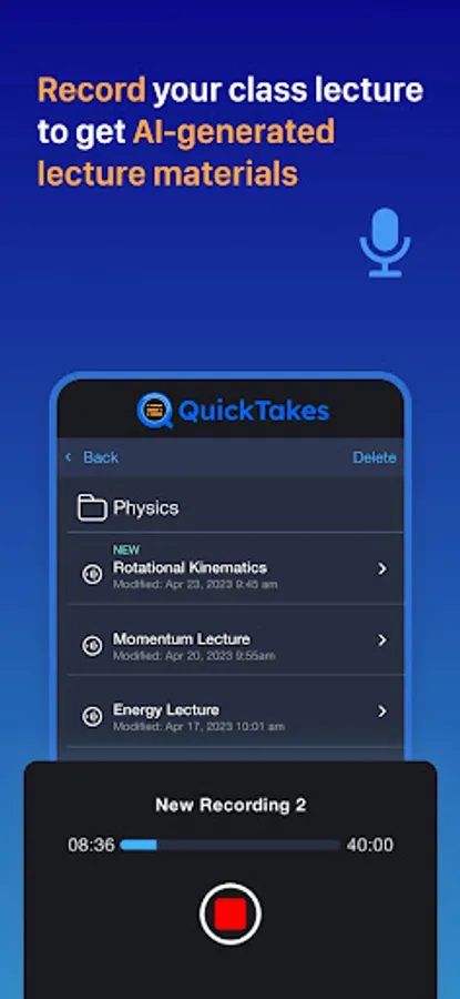 QuickTakes is your AI-generated knowledge app. Generate clear summaries and key concept college notes simply by recording your university class lectures and let QuickTakes do the rest. Receive auto-generated: