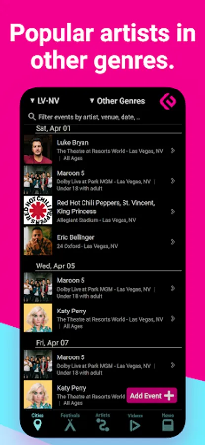 * OTHER GENRES - See what popular artists are coming to your city in genres like hip hop, pop, rap, rock, and country.