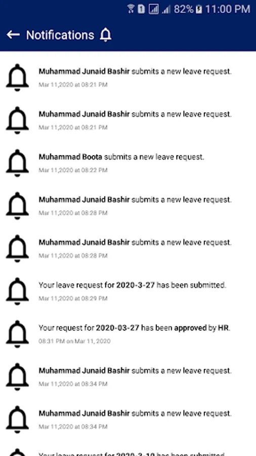 Can apply for leave and get notifications from the admin about approval and disapproval of the leave.