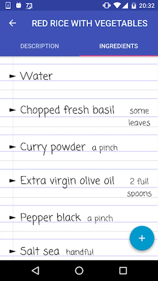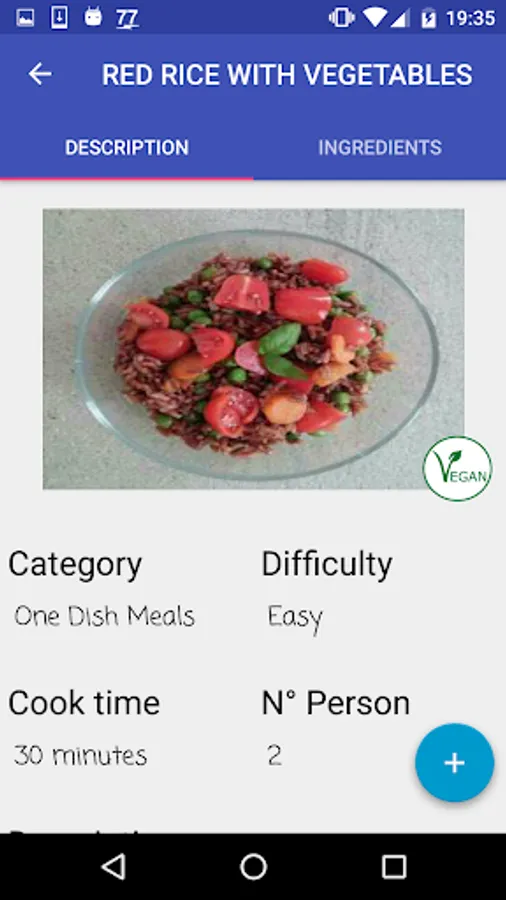 Enter your recipes is easy and quick thanks to a ready to go list of ingredients. You can also customize ingredients of your choice. Your recipes can be grouped by courses and categories.