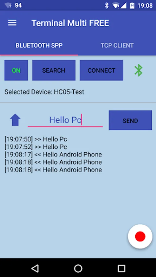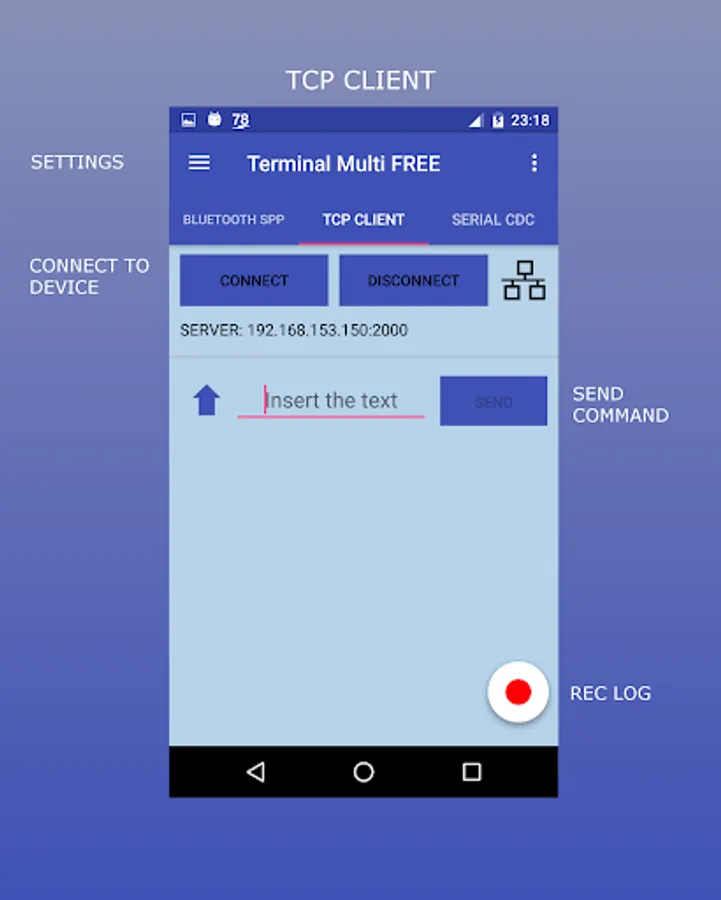2) TCP CLIENT: data are transmited/received between the phone and a compatible device via the tcp/ip protocol (the phone is a client)