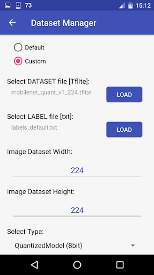 The defaul dataset is: quantized Mobilenet model (mobilenet_quant_v1_224).