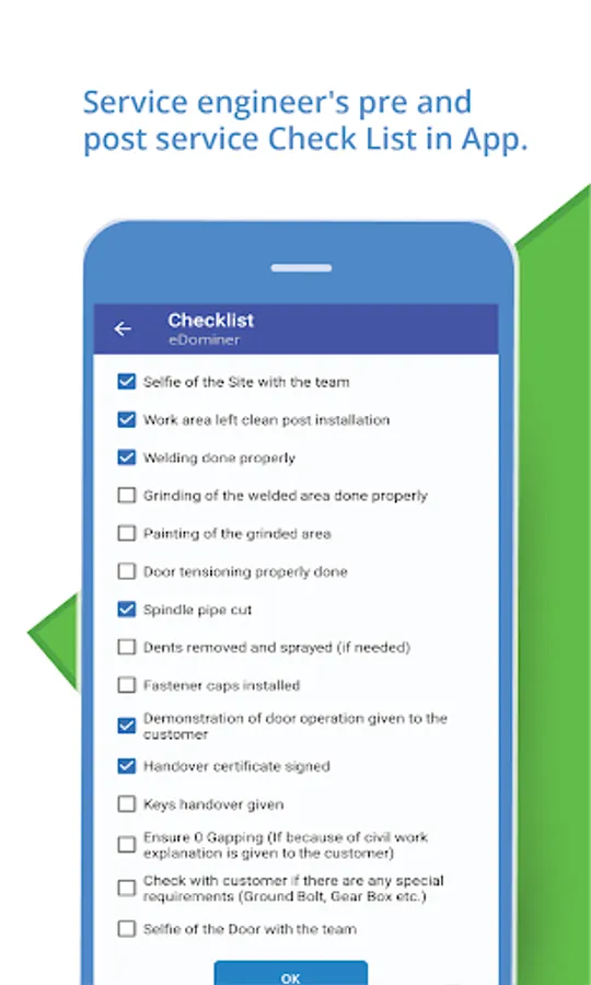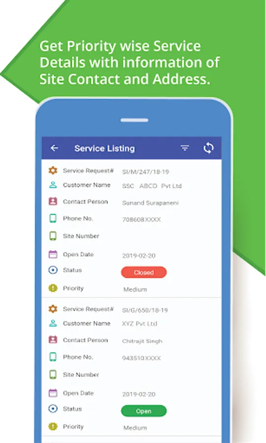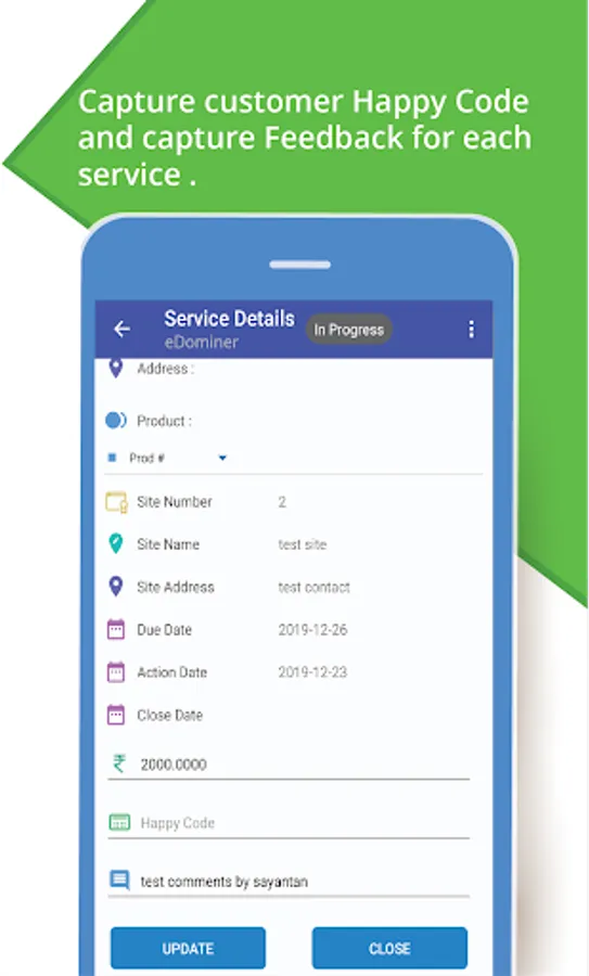 • Service arm can get a list of tasks or services to perform along with important details of products and customer details. It also enlists challenges and due dates and enables customer feedback and happy codes for services.