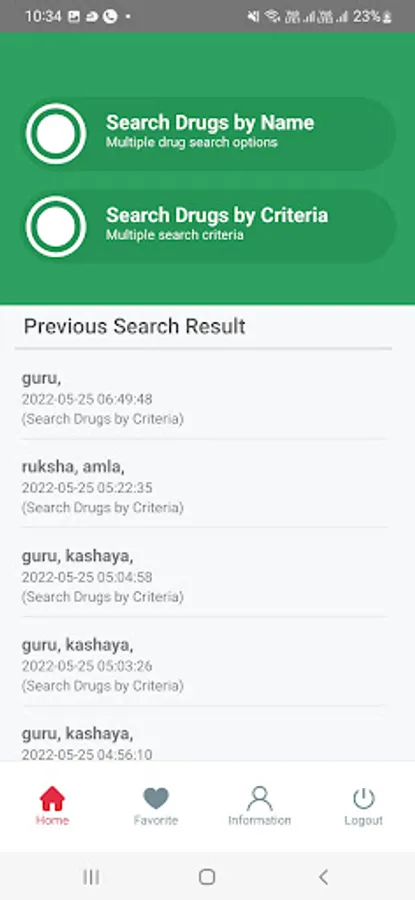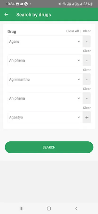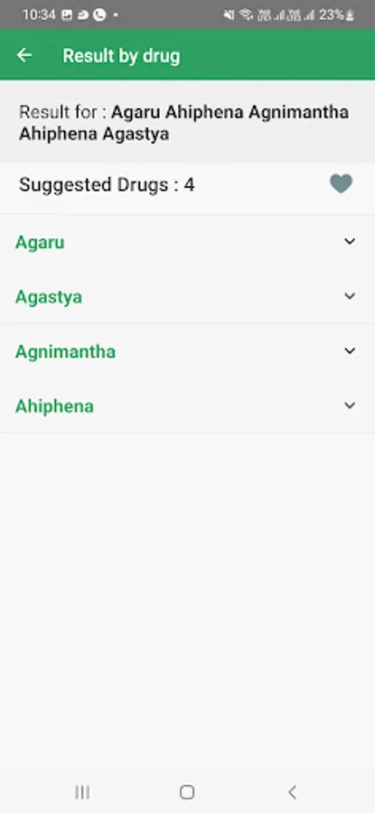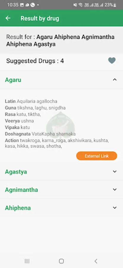 a. You can click on the button and start typing the drug you want to explore. App will suggest you the name and select the drug from the drop-down box and click on search button. You will be taken to the page where you will get the information of the drug like its Rasa, Guna, Veerya, Vipaka, Doshagnata (limited to shamana) and its action (karmukata and rognanata combined and repetitions were removed. Ex. if the drug is having kustagna property then the same includes kushtahara, kushtaroga nashaka, kushtarogahara, etc)