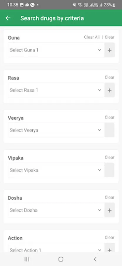 • This is the uniqueness of this app. Here you can click of desired criteria like Rasa, Guna, Veerya, Vipaka, Doshagnata and actions and explore the drugs having those specific criteria. Note: more the criteria you select, the output will be precise.