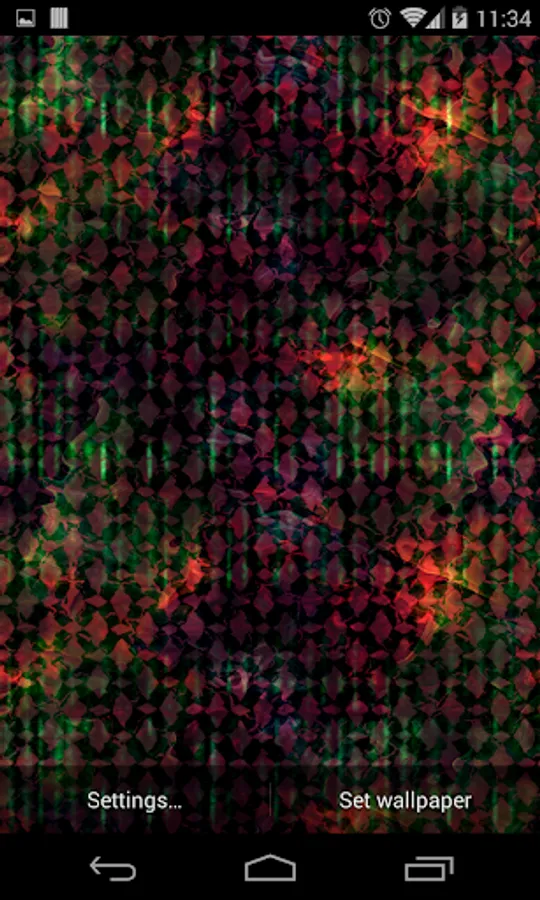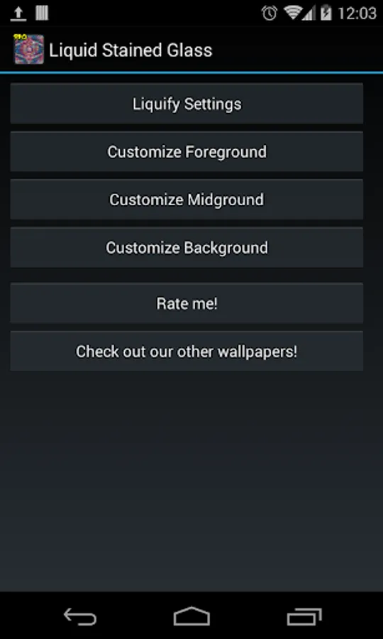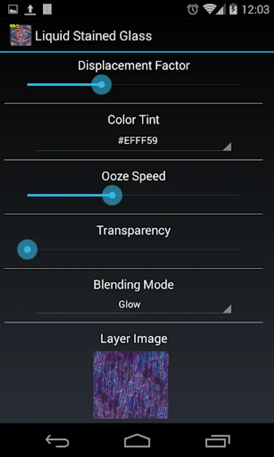 Liquid Stained Glass is a live wallpaper designed to deliver trippy visuals to your device's background. Not only that, with 3 customizable color layers and a number of settings in each layer you can choose to set this up how ever you want. There is a LOT of flexibility here. Just want a single layer visible? No problem. all three moving at the speed of light? Your call. (These options are visible, but not accessible in the free version. )