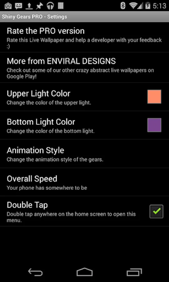NOTE: Modifying the settings for this wallpaper requires a double tap on the home screen. Going through the live wallpaper menu will crash the wallpaper which will require reloading it.