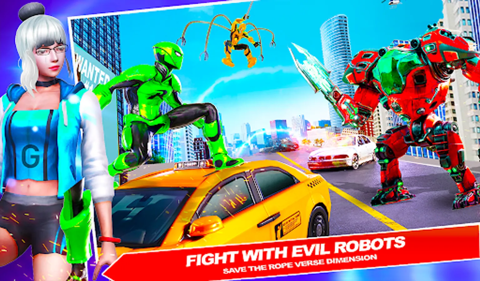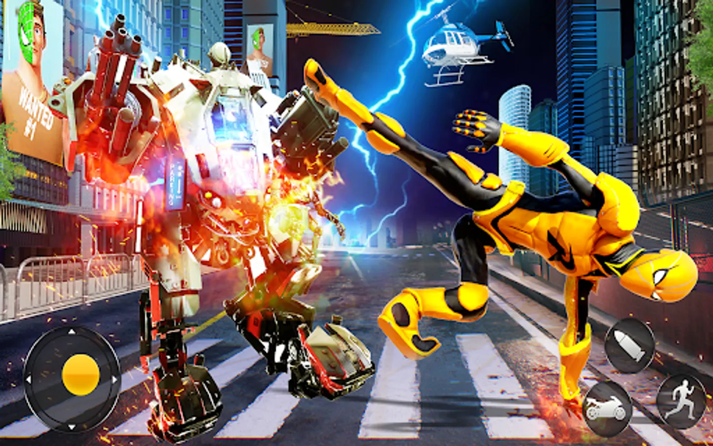Undergo the energetic expert flying hero ninja fight action game. Swarm up the wall and confidentially frisk to the rooftop of the building to fight with the criminal city lawbreakers. Because rope flying hero robot is the only hope that can fight the dangerous gangsters in this great innocent citizen's city. Took a huge rope and scuffle against the great robot war gangsters who want to eliminate you. You are the perfect flying hero in this robot flying hero fighter 3d action game. As an encounter specialist, your duty is to encounter every gangster and mafia lord in this spider flying hero war mission.