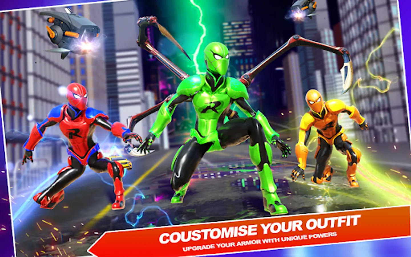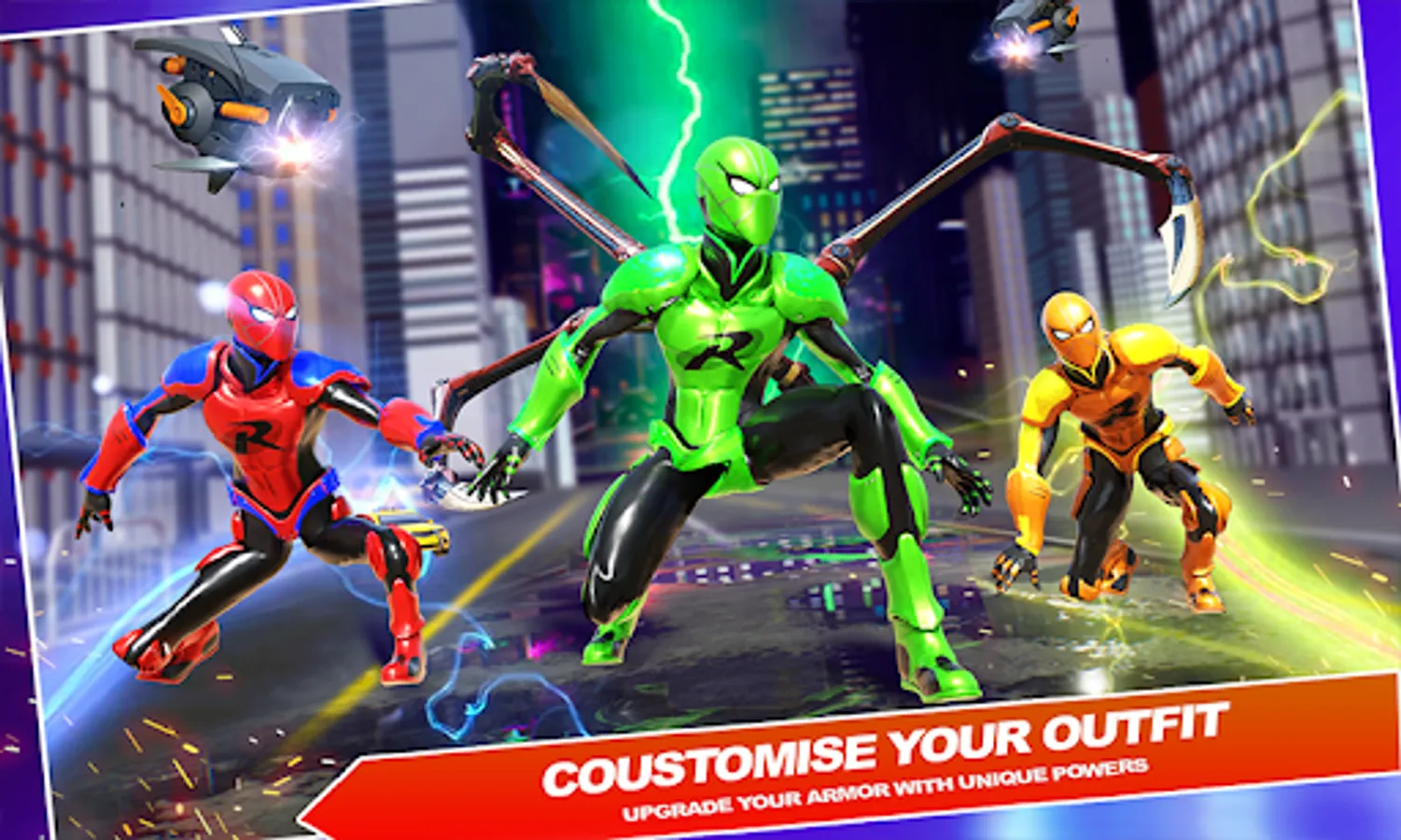 All the citizens are full of fear due to the gangster activities. Become the hero of spider flying robot war mission in the great criminal war of town gangsters. So, perform your duty of spider flying hero fighter 3d and eradicate all the great city crimes and big city robberies.