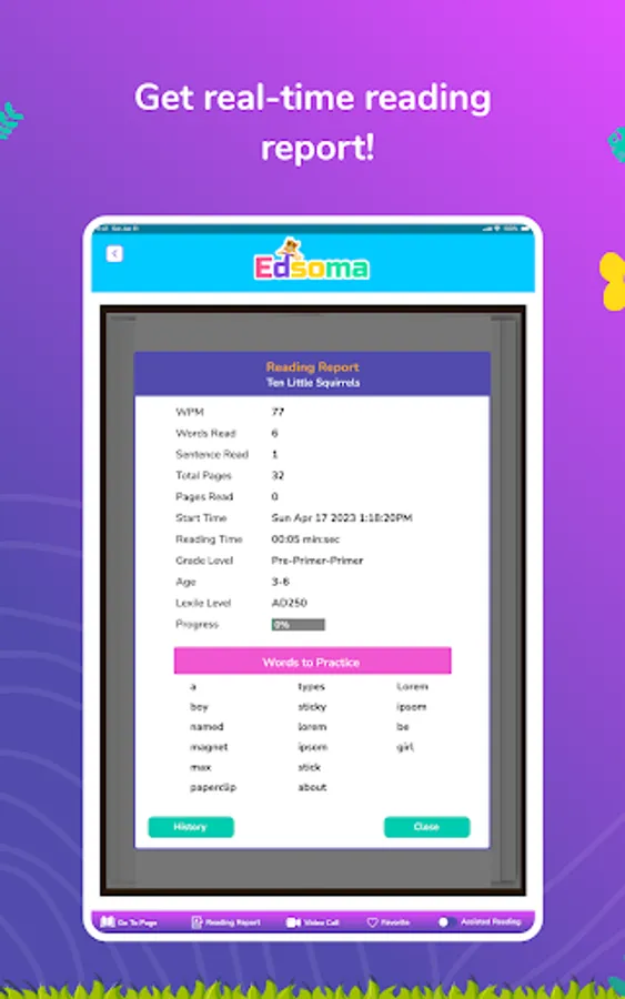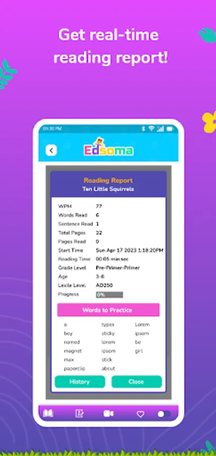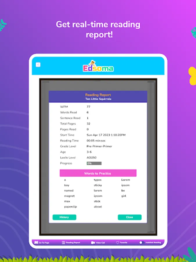 Edsoma uses AI enabled technology & analytical tools to generate a real-time reading report after every reading session. The readers can see immediately how they did and where they can improve.