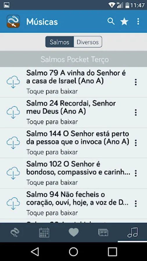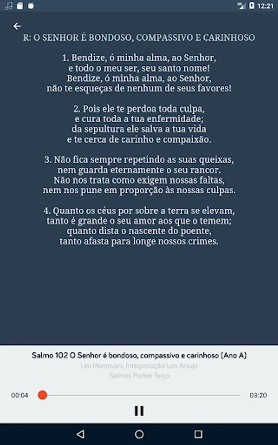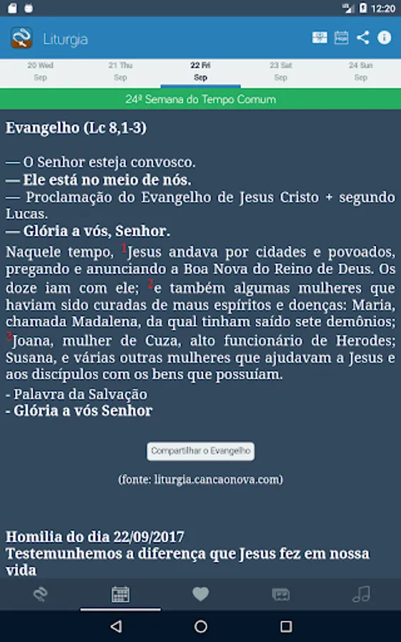 Pocket Rosary has the daily readings (Liturgy of the day): First Reading, Psalm, Second Reading and the Gospel (source: liturgia.cancaonova.com), Day Homily (source: homilia.cancaonova.com) and the day of the saint ( source: santo.cancaonova.com).