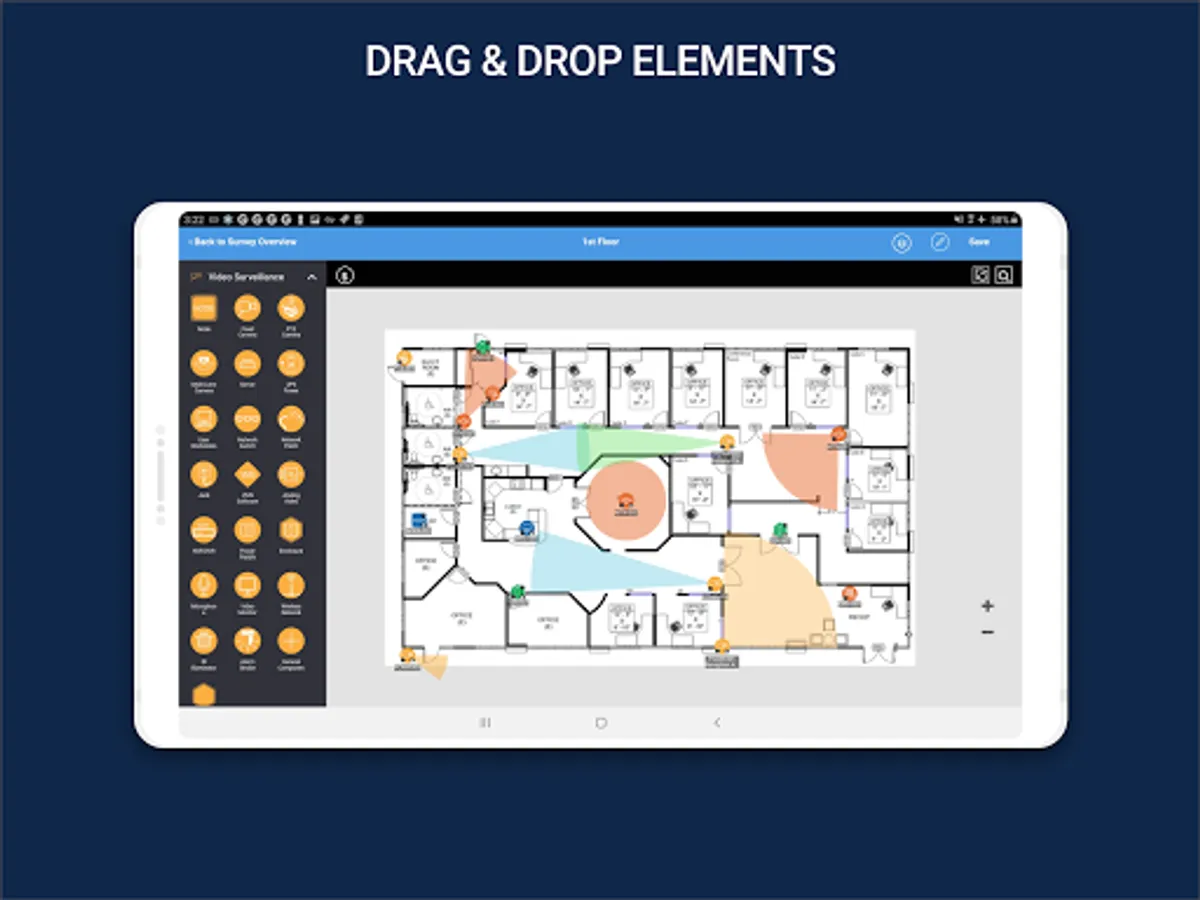 Planning for Security, Audio-Visual, Fire Alarm or IT systems typically begin with a floor plan or site plan to determine which devices go where. Marking up paper floor plans and taking photos with a smart phone is cumbersome and inefficient. With System Surveyor, a system professional can easily import floor plans; drag and drop system elements; capture and report on functional requirements; take and associate photos; and securely share information. System Surveyor digitally captures all of this important information in one place making reference and updates easy, convenient and secure.